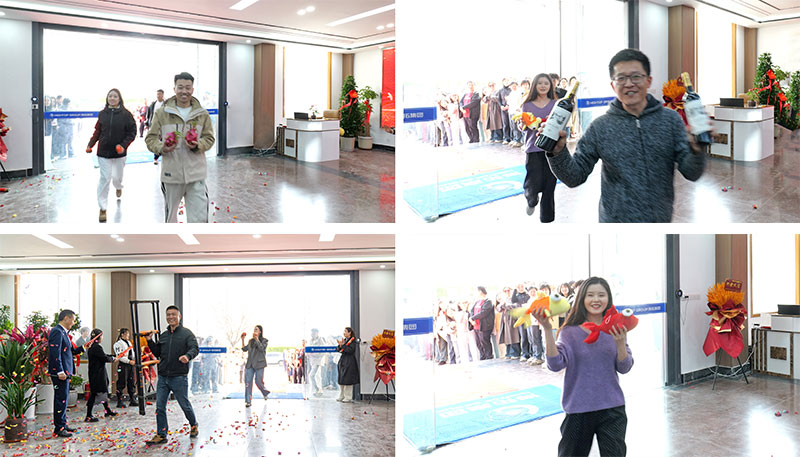 在眾人的期待中,員工代表們手捧寓意美好的物品,邁著整齊的步伐走進(jìn)新辦公大樓。手持現(xiàn)金的員工,寄托著海拓集團(tuán)財(cái)源滾滾的美好愿景;扛著梯子的員工,祝福公司步步高升;拿著柿子茶罐和兩瓶酒,寓意事事如意、長長久久;捧著蘋果的員工,祈愿公司平安順?biāo)?;拿著火龍果的員工,象征著事業(yè)紅紅火火;玩具魚和花餑餑,則寓意著年年有余、生活富足。員工們臉上洋溢著自信幸福的笑容,對海拓的未來充滿期待,也為典禮增添了一抹溫馨而熱烈的色彩。