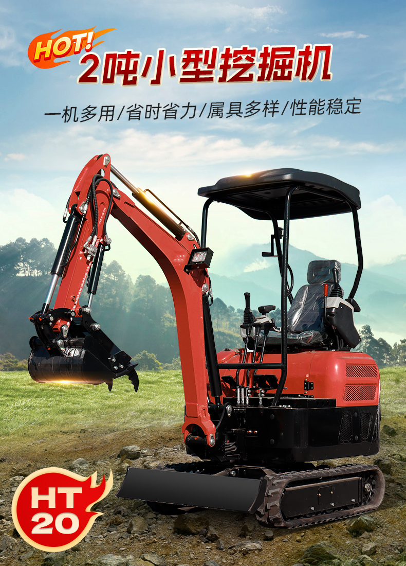 復雜工況(如山地開荒、破碎作業(yè) ):對動力和屬具兼容性要求高。海拓 HT18 挖掘機,配備品牌發(fā)動機,動力強勁,支持 30 + 種屬具(如破碎錘、松土器 ),應對破碎、挖掘、抓舉等多場景作業(yè);HT20 作為 2 噸級機型,大臂油缸倒立設計增加挖掘深度,屬具多樣,也適配復雜工況。
