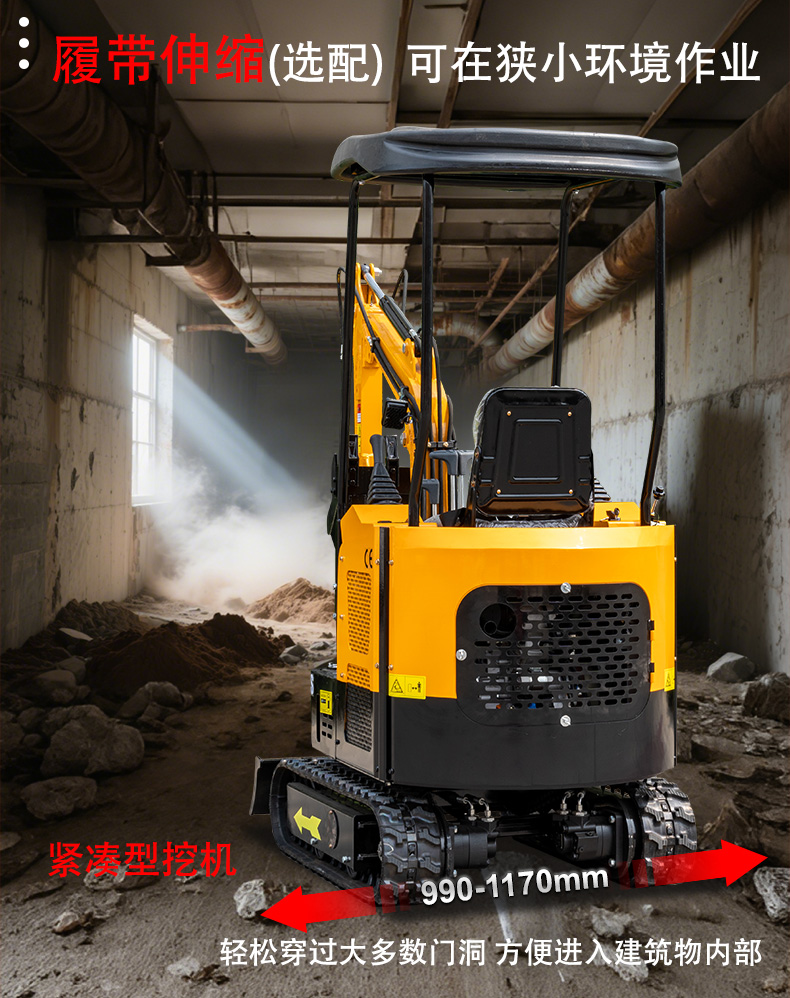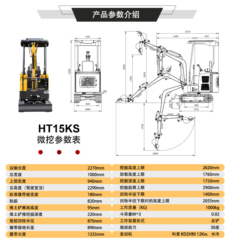 在整機尺寸方面,它運輸長度僅 2270mm,總寬度 1000mm,上部寬度 940mm,總高度(駕駛室頂)2290mm,這樣緊湊的身形使其能輕松穿梭于狹窄場地。標(biāo)準(zhǔn)履帶板寬度 180mm,軌距 820mm,履帶接地長度 890mm,履帶長度 1235mm,配合 30 度的爬坡能力,確保在多種地形都能穩(wěn)定行駛。推土鏟離地高度 95mm,推挖掘深度 220mm,尾部回轉(zhuǎn)半徑 870mm,進一步提升了其在受限空間內(nèi)的操作靈活性。