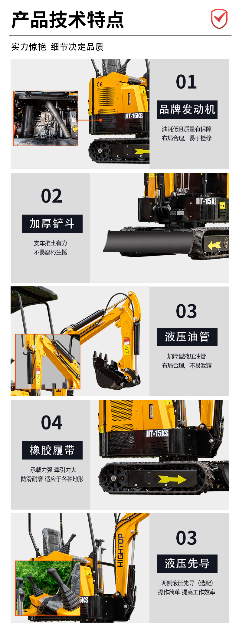 主要零部件選用可靠產(chǎn)品,發(fā)動機為科普 KD2V80,主閥為騰飛,為整機的穩(wěn)定運行提供了有力保障。無論是小型工程施工、庭院改造還是農(nóng)業(yè)作業(yè),HT15KS 微型挖掘機都能憑借其靈活高效的特點,成為得力助手。